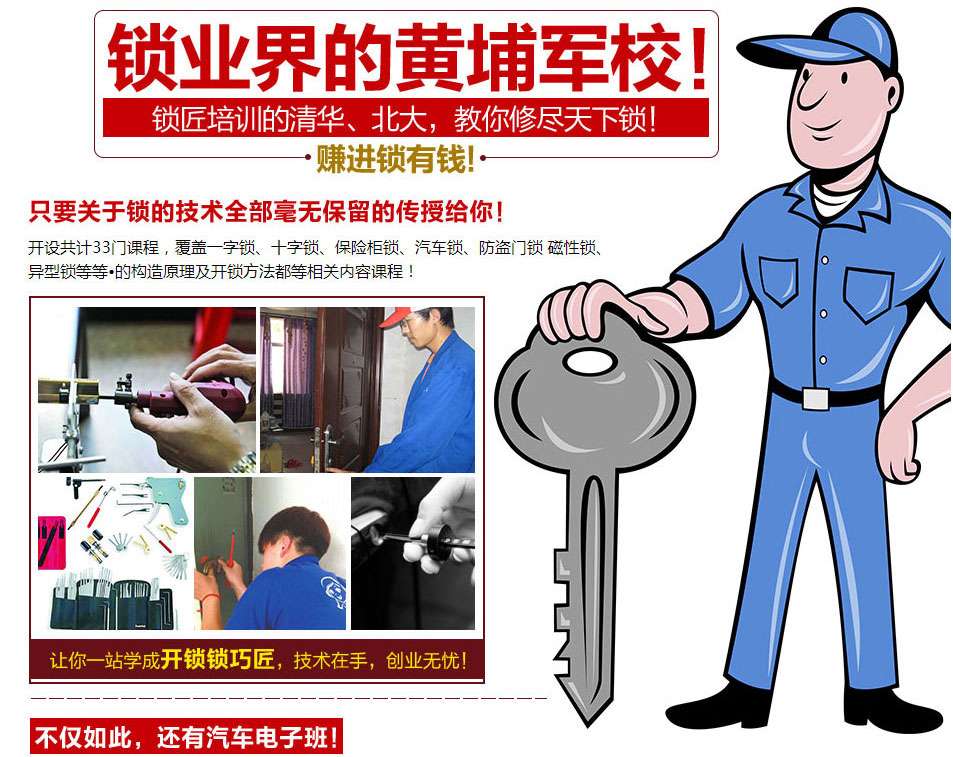 巨龙开锁技校面向全国各地招生,本校以诚信为教学根本,过硬的技术,良好的教学环境,优良的师资,一对一教学,想学真技术请你来巨龙开锁技校,是你致富的最佳选择,毕业回家就独立开店,我们终生技术支持。学员毕业颁发全国通用职业资格证书(锁具修理工),可全国联网查询。